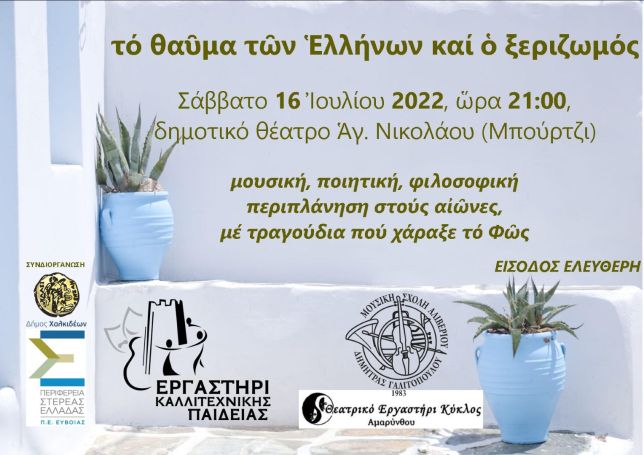 ARTS LAB aka ʽErgastiri Kallitexnikis Paideiasʼ was established in 2002 in Vasiliko, the capital town of the former Municipality of Lilantion near to Chalkida the capital of Evia Island – and is run as a municipal corporation for cultural growth. Soon it became popular to students and adults as the main cultural center of the area. Besides taking the leading role in creating culture and art to the local society, the ARTS LAB has often collaborated and inspired other cultural societies and private individual art and music schools.